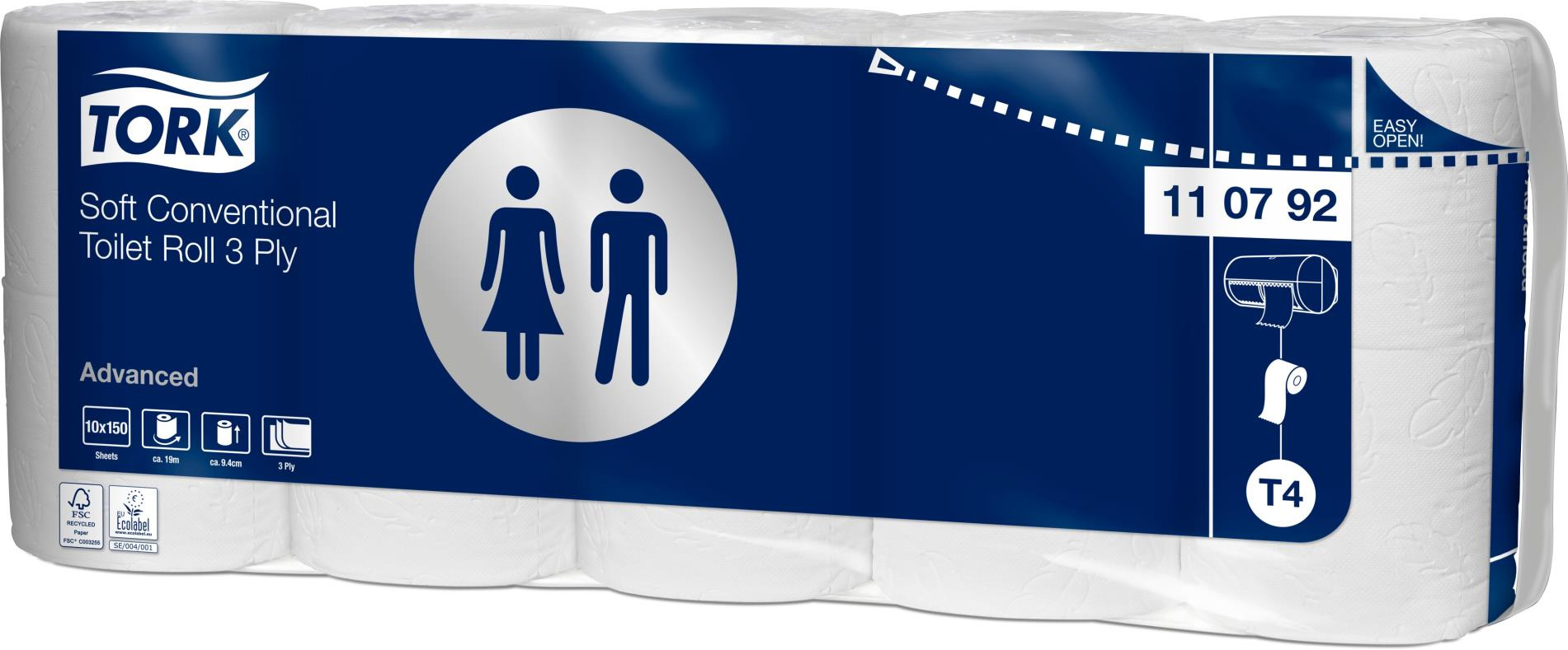 Kvalitní, bílý, třívrstvý toaletní papír. Tork systém T4. Recyklovaný. Celý popis