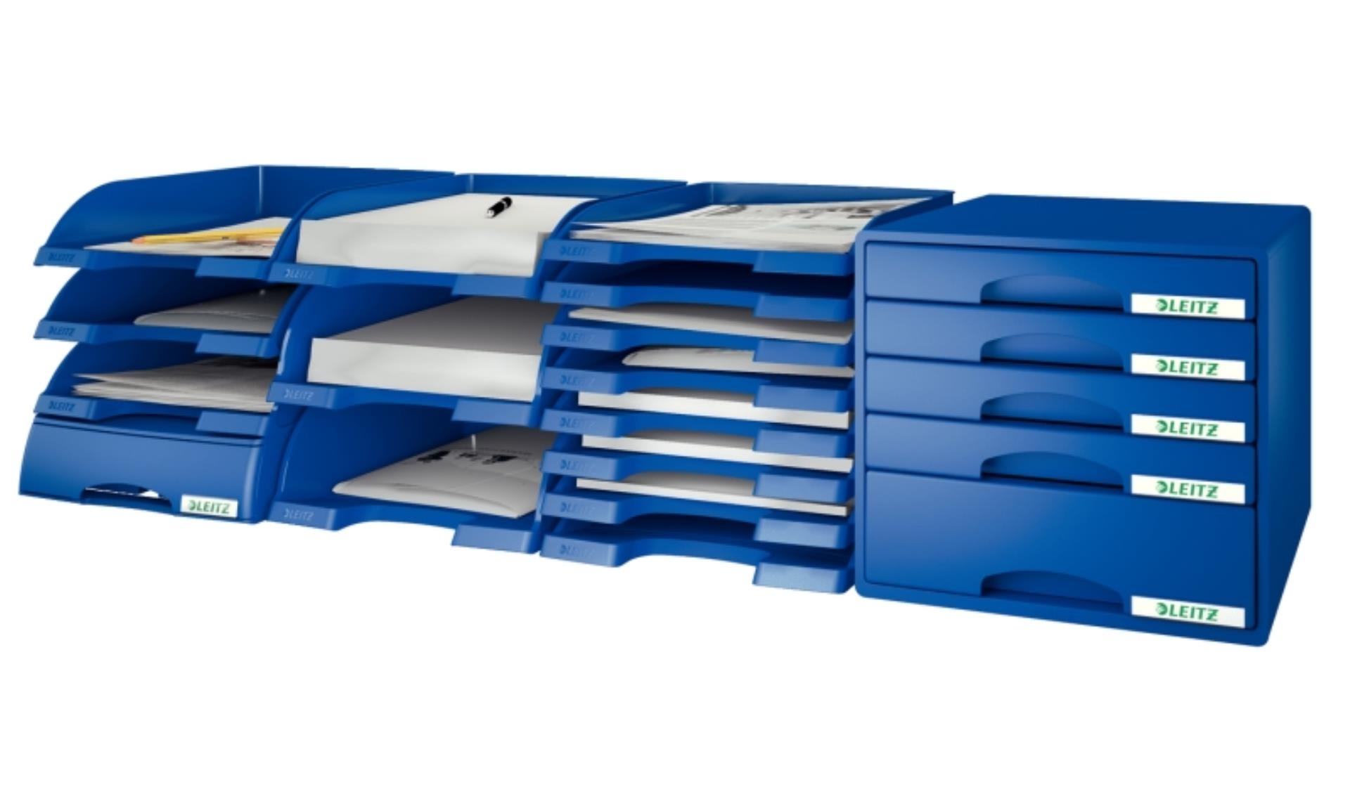 Zásuvku možno stohovat kolmo nebo předsazeně a vzájemně kombinovat ještě i se zásuvkou Leitz Plus