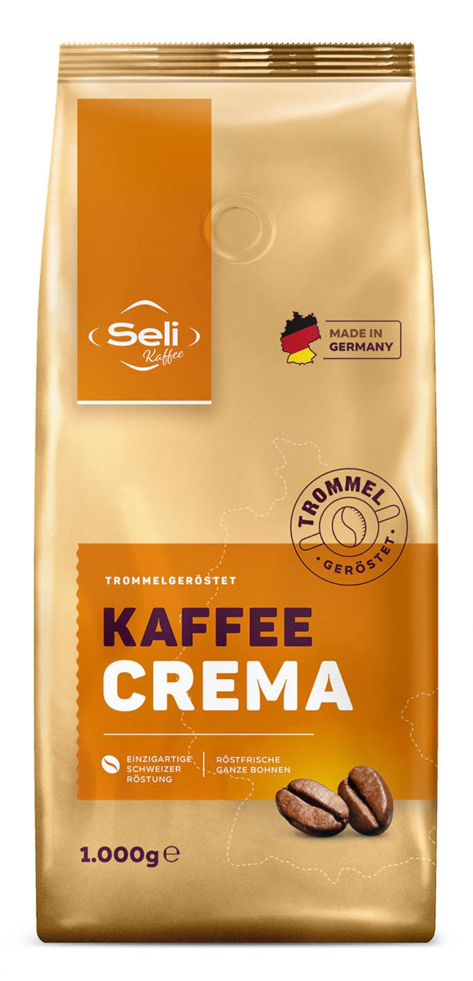 Pražená zrnková káva Seli - Crema, vybrané kávové odrůdy a švýcarský způsob pražení kávě dodají plnou chuť a hedvábnou vrstvu nadýchané zlatavé pěny. Robusta 90%, Arabica 10%. Hmotnost: 1 000 g. Celý popis